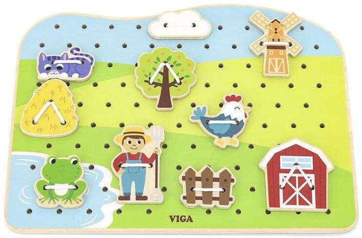 A Viga fűzős játék - farm egy igazán lenyűgöző játék, amely nagyszerű lehetőséget kínál a gyermekek számára a szem-kéz koordináció és a térbeli tájékozódás fejlesztésére. A készlet tartalmaz egy lyukakkal ellátott, fából készült alapot, amelyen egy gyönyörű farmot ábrázoló grafika található. Ezen kívül a csomagban 20 csodásan megfestett farmállatot és