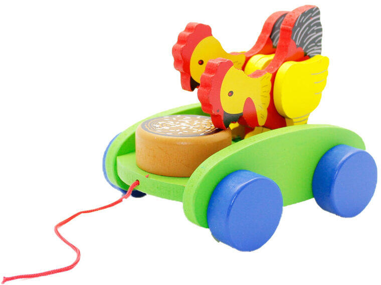 Húzd magad után a színes, fából készült játékot és a kakasok menet közben felváltva csipegetni fognak. Mérete 20 x 22 cm.