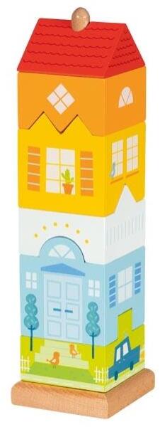 Goki 58358 toronyház montessori építőjáték. Hat szintes oszlopépítő torony különleges emeletekkel. Színes fából készült torony. Ahhoz, hogy a városi toronyház valóban szép legyen 6 szintet kell egymásra helyezni megfelelő illesztéssel. A középső natúr fa rúd egyben tartja az épülő elemeket. Ha helyesen kerültek egymásra az emeletek akkor egy csodaszép, színes és