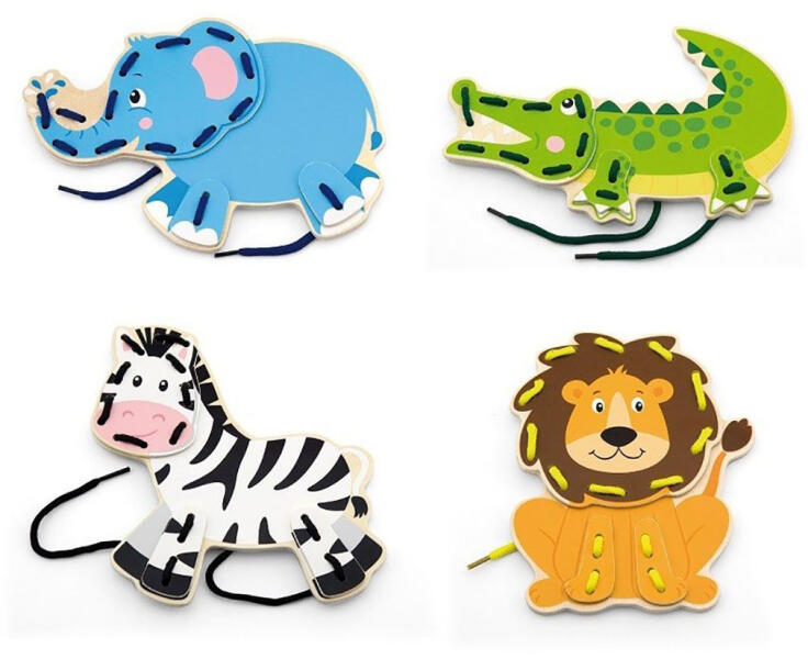A Viga cégtől származó húzófa egyike a legszebb játékoknak, amely sokáig tart, és sok éven át biztosítja gyermekének az érdekes és kreatív játékot. A kötéllel játszott játék célja, hogy fejlessze a kézügyességet és a látáskészséget. A készlet 4 állatot tartalmaz az állatkertből: Elefánt Krokodil Zebra Oroszlán A játékot 3 évesnél idősebb gyermekek szám
