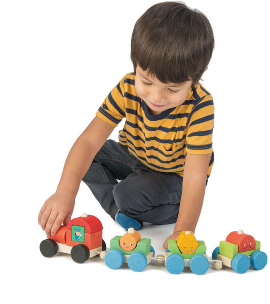 Tervezte és készítette a Tender Leaf Toys Vidám kis vasút geometriai formákkal.