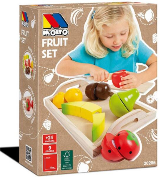 Molto: Fa gyümölcsszett tálcával 9db-os Hivatalos magyarországi forgalmazótól. Leírás: Remek kiegészítője lehet a kicsik konyhai játékának ez a fa gyümölcsszett, hiszen összesen hat különböző gyümölcsöt is tartalmaz: alma, körte, banán, citrom, kivi és eper is megtalálható a szettben, melyek mindegyike különleges kialakítással készült. A gyümölcsök szeletei t
