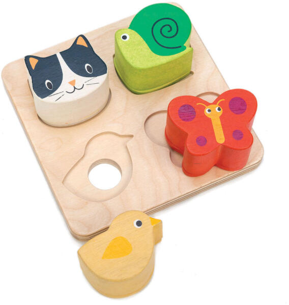 Tervezte és készítette a Tender Leaf Toys 4 színes tömörfa forma, amelyek mindegyike alatt más-más tapintható elem található. Ez a játék puha, sima, selymes és gumiszerű érzésekkel fejleszti kisgyermeke tapintását. A formaválogató rétegelt lemez tálcán kerül bemutatásra. 18 hónap+