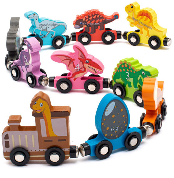 Játék és tanulás egyben! A Dino Montessori Baby Mix fa vonat a kreatív játékot ötvözi az oktató elemekkel. Minden kocsirész egy különböző dinoszaurusz fajtát és számot képvisel, amely segít a gyerekeknek fejleszteni a kognitív képességeiket, a finommotorikát és a számolás alapjait. A mágneses csatlakozóknak köszönhetően a gyerekek könnyen összekapcsolhatják és s