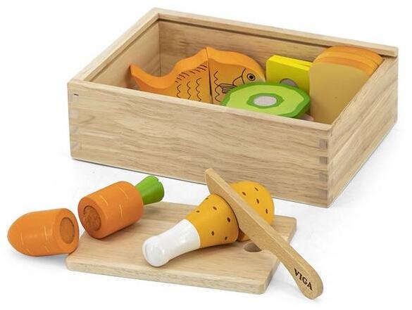 A Viga fából készült főzőkészlete tökéletes választás a gyermekek konyhai és kézügyességének fejlesztésére. A szett tartalmaz egy vágódeszkát és egy fakést, melyek segítségével a kicsik megtanulhatják az étel darabolásának folyamatát, ezáltal javítva a szem-kéz koordinációjukat is. Minden ételdarab tépőzárral van ellátva, ami megkönnyíti a játékosok sz