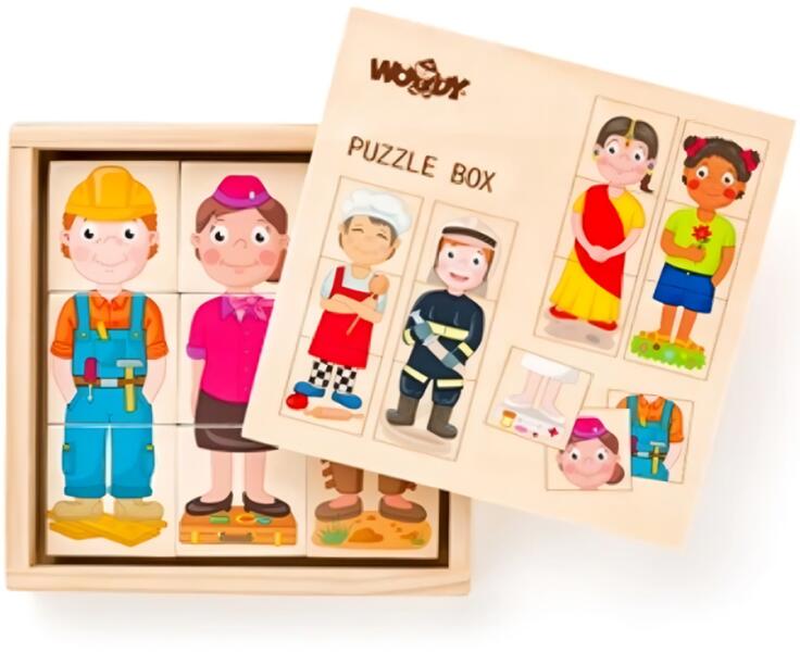 Foglalkozások fa kocka kirakó - Woodyland Hivatalos magyarországi forgalmazótól. Leírás: Ez a fa kocka kirakó egy szórakoztató és tanulságos játék, amely segít a gyerekeknek megismerni különböző foglalkozásokat és kultúrákat. Az élénk színű, kedvesen illusztrált figurák között található többek között építőmunkás, szakács, tűzoltó, valamint különböző n