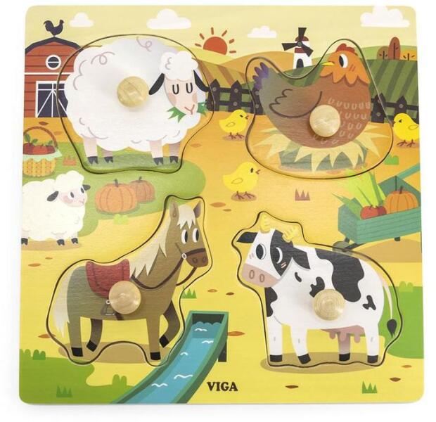 A puzzle-darabok fából készült fogantyúkkal vannak ellátva, amelyek megkönnyítik a gyerekek számára a darabok megfogását és a megfelelő helyre való elhelyezését a fa alaplapon. Ez a játék kiváló lehetőséget kínál a koncentráció és a szem-kéz koordináció fejlesztésére. Ezen kívül a játéknak köszönhetően a gyermek motorikus képességei és logikus gondolkodá