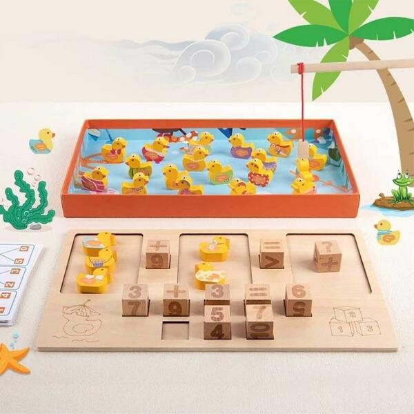 Montessori játékok alapjaira épülő matematikai fejlesztő játék és horgászjáték Kiszerelés: 36-db-os Tartalma: 1 db fa tábla, 2 db horgászbot, 10 db tömör fa kocka, 23 db kacsa, 12 db számkártya/műveletkártya Mérete: Fa alap: 34,5 x 19, 5 cm Horgászbot: 15 cm , Fa kockák: 2,5 x 2,5 x 2,5 cm, Kacsák: 3,5 x 3 x 1 cm , Feladatkártyák: 13 x 8 cm Doboz mérete: 36 x 20,5 cm Mo