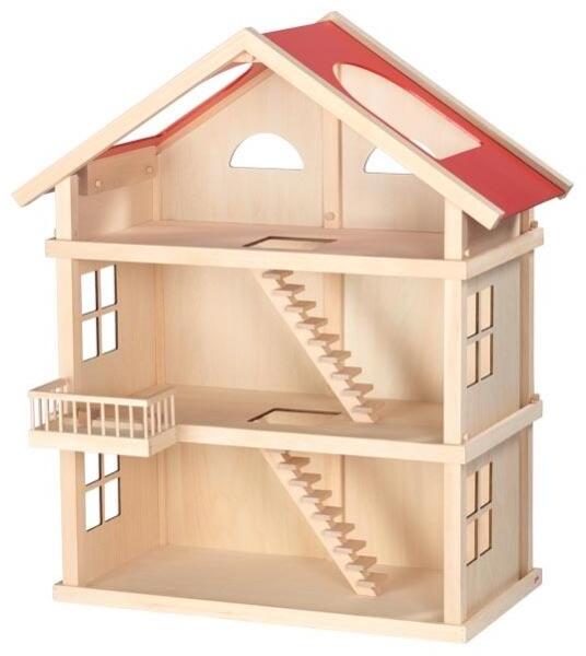 Goki 51957 óriás babaház 86 cm magas, három szintes, tetőteres nagy ablakokkal és egy kis erkéllyel, hajlítható fa babák számára. Ebben a nagy fa babaházban nagyon sok hely van a bútoroknak és a fababa-családnak. Három szinten valamennyi helyiség elfér, az emeletek között lépcső vezet. Nagy ablakok, tetőablak és erkély is tágítja a teret. A háromszintes nagy babaház b