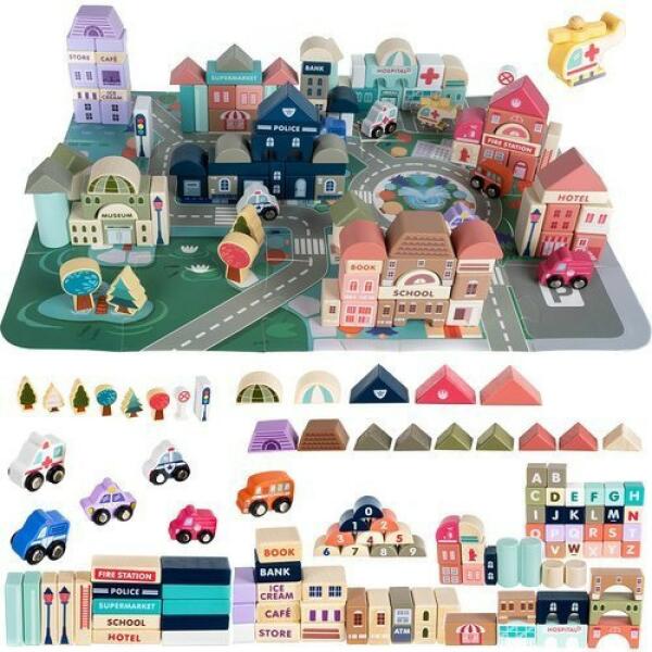 A színes , fából készült kocka szett 115 elemet tartalmaz. A kockák különböző formájúak, méretűek , élénk színekkel és városi motívummal díszitve. Olyan formákat talál a szettben, mint a kocka , téglalap , háromszög , henger , híd , stb. A csomag belsejében egy útmutató található különböző épületek, városok és tárgyak készítéséhez, amelyek inspirálják