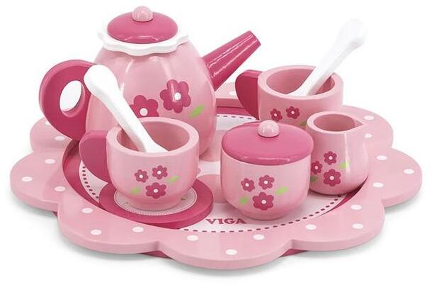 A VIGA fából készült teáskészlet 12 különleges elemet tartalmaz: egy elegáns teáskanna, egy praktikus tejeskanna, egy cukortartó, két csésze csészealjjal és kanállal, valamint egy gyönyörű, dekoratív tálcát, amely mindent egy helyen tart. Ez a készlet prémium bükkfából készült, és színes, nem mérgező festékekkel van díszítve, amelyek élénk árnyalatokat adnak