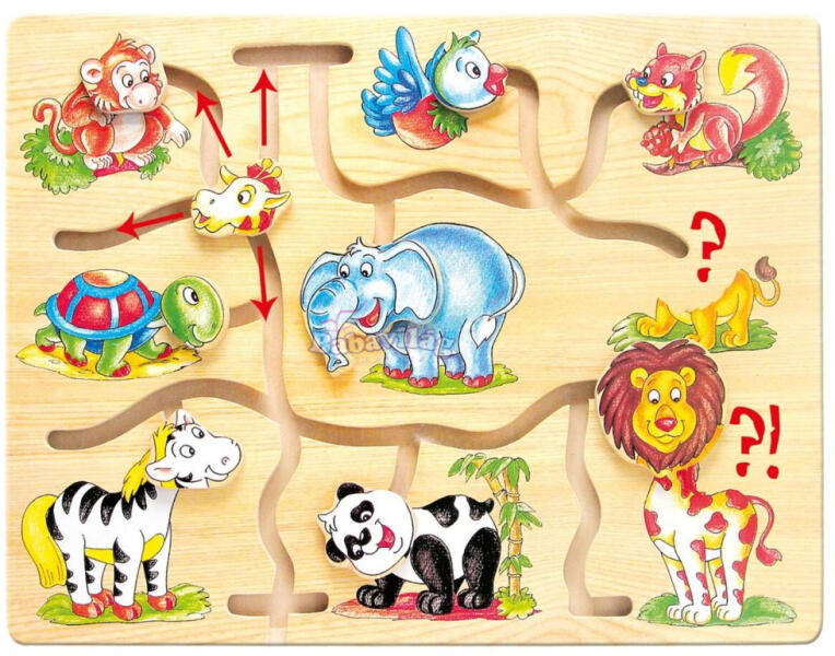 A labirintus nem csak jó móka, hanem a kisujjak gyakorlása is. Fából készült puzzle. A fa alapon egy labirintus és akár 9 egzotikus állat található, amelyek elemeit a labirintus körül mozgatva kell összekapcsolni. Itt található: egy zsiráf, egy majom, egy teknős, egy panda, egy elefánt, egy oroszlán, egy papagáj, egy zebra és egy mókus. Kor: 10m+ Méretek: 30 x 2 x 22 cm Hi