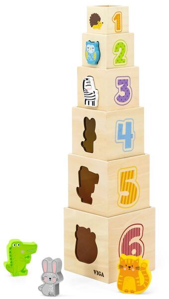 Klasszikus játék modern kiadásban, ideális 12 hónapos kortól. 6 különböző méretű fakockából áll, amelyek piramisba rendezhetők vagy egymásra rakhatók. Mindegyik falon más-más motívum található: színes számok, állatok, szortírozó kivágások és hozzá illő állat alakú blokkok, míg az egyik fal átlátszó színes műanyagból készült. Ez a sokoldalú játék serke