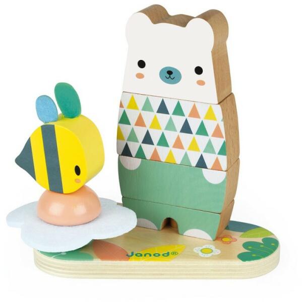 Janod montesszori fajáték, Az alaplapon 2 montesszori torony építhető meg. Az egyik a mackó, mellette pedig egy méhecske virágon. A játék fából készült kimondottan kisgyermekeknek 1 éves kortól. A virág szirma és a méhecske szárnya filcből készült. A montesszori medve mérete: 15,5 x 9 x 14,5 cm