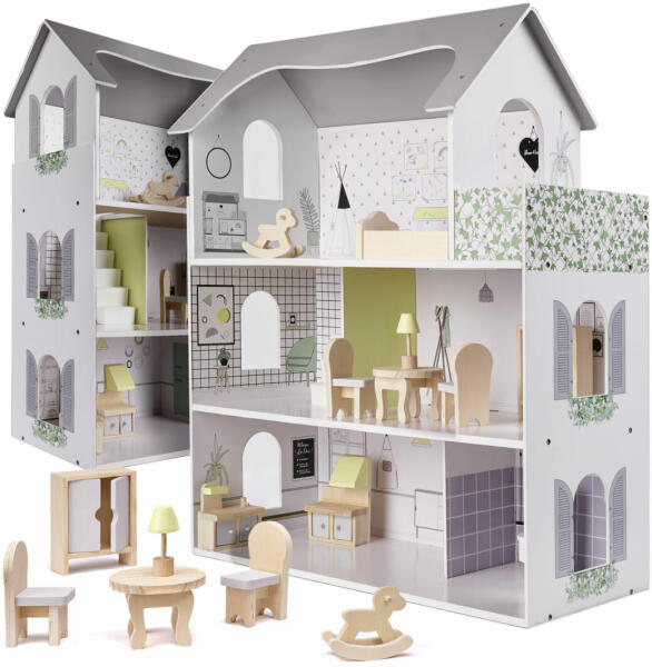 Fa babaház 70 cm. Gyönyörű fa babaház modern stílusban, minden gyermek álma! A modern kastély egyenesen a meséből való, minden kisgyermek a villa jogos tulajdonosának fogja érezni magát, és ami a legfontosabb, tökéletes otthona lesz az összes babának, kabalának és figurának. A tágas szobákban még a kisgyermek barátai által hozott vendégek is elférnek. A háromszintes h