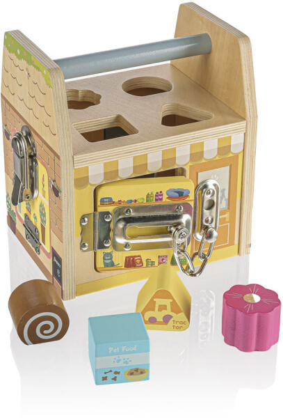 Ennek a fakockának minden oldala más-más üzletet jelképez, és minden üzletnek, ahogy kell, megvan a maga speciális zárja a rablók ellen. A gyerekek a zárakkal játszva sajátítják el a logikát és a térérzékelést. Szórakozás otthon és látogatáskorA fából készült fogantyúnak köszönhetően könnyedén magaddal viheted a kockát látogatásodra vagy kirándulásra, és