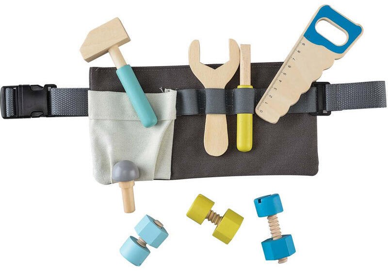 Ez a szerszámtartó öv szerszámokkal garantáltan a kisfiúk kedvence lesz! Az övben az igazihoz nagyon hasonlító fa szerszámok kaptak helyet, hogy a kis ezermestereknek mindig kéznél legyenek legfontosabb eszközök, mint például a kalapács, a fűrész, vagy a csavarok. Az öv állítható, így a könnyen méretre igazítható. A fából készült szerszámok, mint a csavarkulcs tök