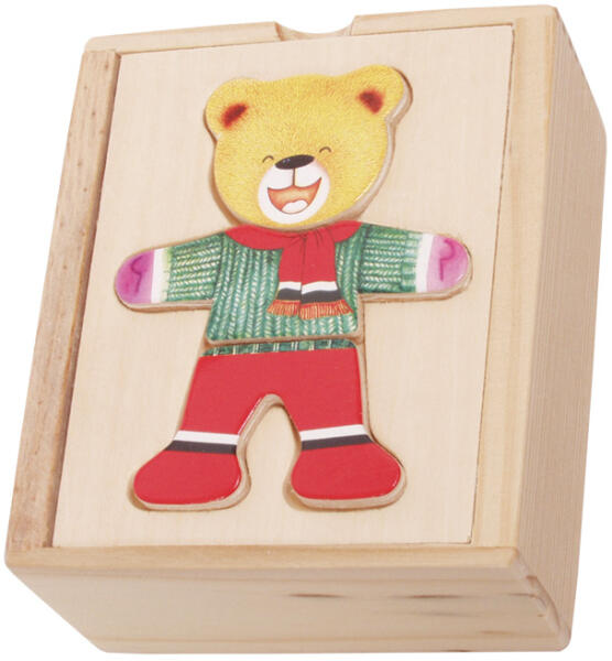 RAKTÁRRÓL AZONNAL! Nagyszerű készségfejlesztő játék 18 elemet tartalmazó fadoboz tárolóban. A játék lényege, hogy a gyermek megtalálja és a megfelelő helyre illessze a maci fiú főbb testrészeit. Nagyban segít abban, hogy a gyermek játékosan tanulja meg a különböző ruhadarabok neveit, az emberi test főbb részeit és a különböző arckifejezéseik jelentéseit . A hatf