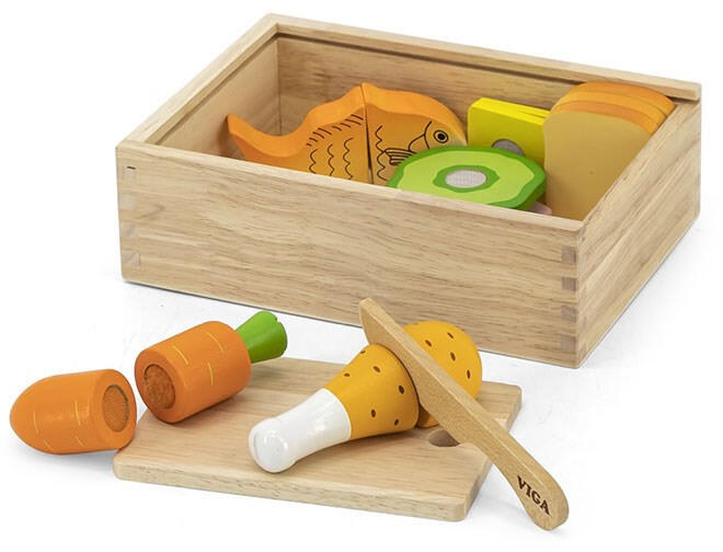 A Viga fából készült főzőkészlete kiváló játék gyermeke konyhai és kézügyességének fejlesztéséhez. A készlet tartalmaz egy vágódeszkát és egy kést, így gyermeke megérti, hogyan kell az ételt darabokra vágni, miközben fejlődik a szem-kéz koordinációja. Minden egyes ételdarab tépőzárral van ellátva a könnyű összeszerelés és szétválasztás érdekében. A k