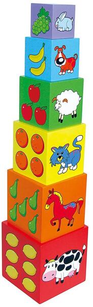 Fa oktatási piramisa Viga. Érdekes, kreatív játék, amely hosszú ideig sok szórakozást nyújt a gyerekek számára. A készlet 6 db, különböző méretű, színes fából készült kockákat tartalmaz, amelyek az egyik oldalán nyitottak és ezért szépen illeszkednek egymásba. Ez a fantasztikus játék didaktikus segédeszközként működik. A kockákat gyönyörű állatok, geometria
