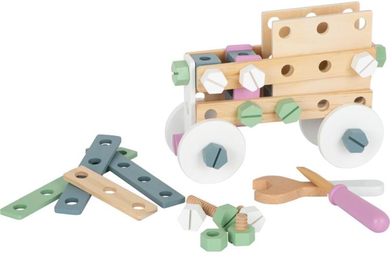 Small foot 11875 nagy fa szerelő készlet fa szerszámokkal, panelekkel és alkatrészekkel, gépépítő készlet pasztell színben. Építés és bütykölés skandináv stílusú eszközökkel. Fúrt lyukak, menetes kockák, csavarok, anyák, fatárcsák és építőelemek segítségével a fiatal építőmérnökök igazán szabadjára elengedhetik magukat. A csavarkulcs és csavarhúzó seg