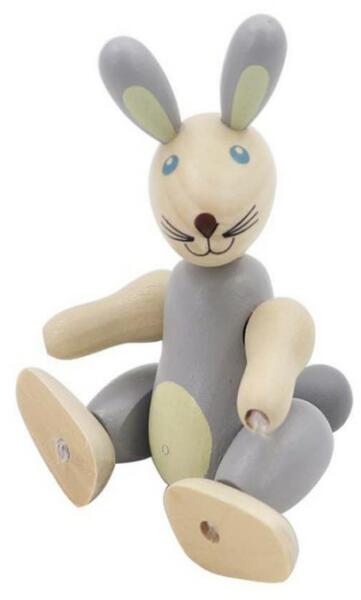 Mozgatható végtagokkal rendelkező fabábú, ami egy aranyos nyuszit személyesít meg. Gyermeked nagyszerű szituációs játékokat tud kitalálni ezzel a nyuszi figurával, főleg, ha összegyűjtitek hozzá a többi kis fa figurát is. A nyuszi mérete 11cm x 6 cm, ami kitűnő méret a kis kezeknek.