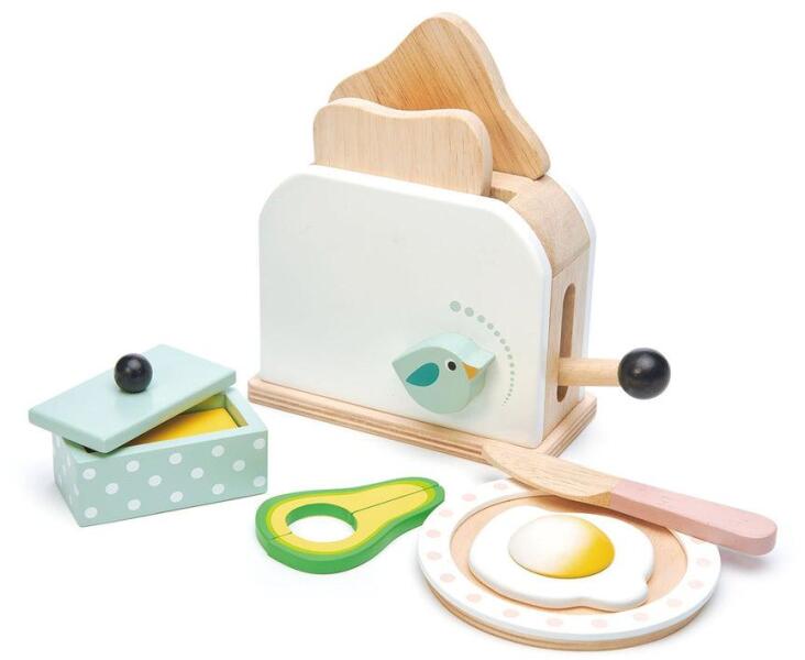 Tervezte és készítette a Tender Leaf Toys Kényeztesd magad egy egészséges és modern reggelivel! Készítsd ezzel a mesés kenyérpirító készlettel, amihez buggyantott tojás és avokádó is jár. Pirítsunk meg 2 szelet kenyeret, forgassuk a madárgombot forróra, húzzuk fel, ha készen vannak, kenjük meg a pirítóst a fakéssel, majd együk meg egy buggyantott tojással és 2 szelet