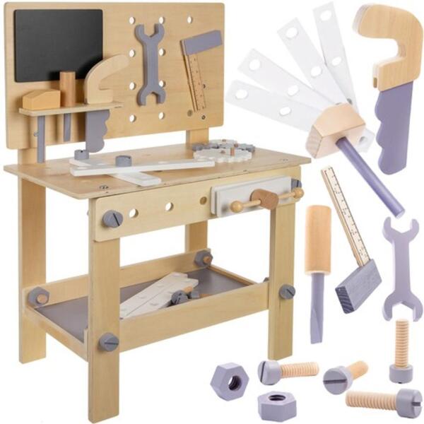 Játékműhely Faműhely – az első lépés a nagy projektekhez ! Fejleszd a kis ezermestereket egy szerszámokkal teli faműhellyel ! Tökéletes készlet a játék közbeni tanuláshoz biztonságos, kreatív és tökéletes a kis kezek számára . Remek ajándékötlet 3-7 éves gyerekeknek A készlet a legkisebbek biztonságát szem előtt tartva készült, minden elem lekerekített és ter