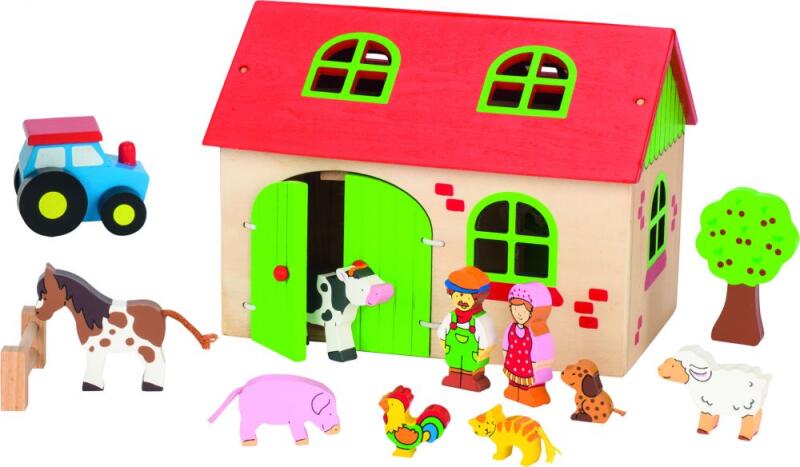 13 db-os fa játék istálló készlet háziállatokkal. Anyaga: fa Méret: 19,3 x 13,5 x 14,3 cm