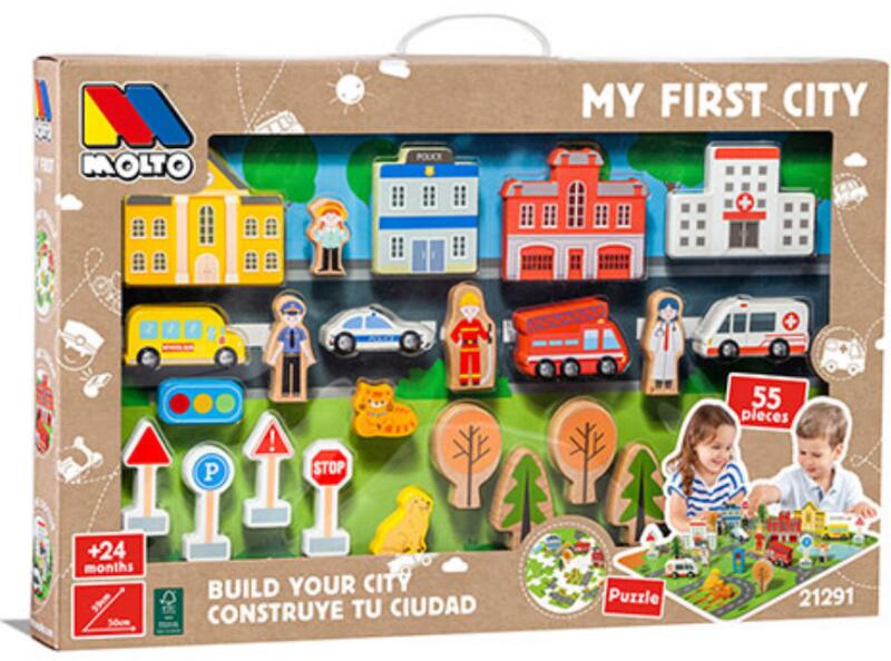 Molto: Nature My First város fa játékszett 55db-os Hivatalos magyarországi forgalmazótól. Leírás: Ez a vagány doboz egy komplett kis játékvárost tartalmaz a gyerekek számára, akik egészen biztos, hogy örömmel fedezik majd fel minden apró részletét. Elsőként összeállíthatják a 32 darabos puzzle elemekből álló várostérképet, utána a helyére kerülhetnek az épülete