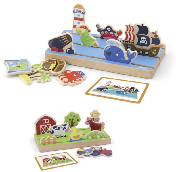 Kettő az egyben játékkészlet. Tengeri kalandok vagy a farm körüli munkák ? A gyermek képzelete szabadon szárnyalhat. A készlet tartalma: - fából készült kétoldalas talp - az egyik oldalon zöld (a gazdaság megszervezéséhez) és másik, oldalon kék (a tengeri kalandok megszervezéséhez) - faelemek a gazdasághoz: istálló, kerítés, lány, almafa, tehén, kakas, virágágyás,