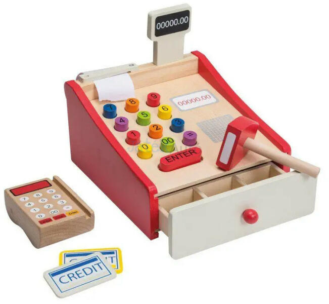 Fa pénztárgép - Jouéco. Igazi szép fa pénztárgép, szkennerrel és terminállal. Tényleg lehet nyomkodni a gyönyörű színes gombokat. Nagyon szép kiegészítője az üzletének. A kártyás fizetés nem jelent problémát az üzletében, mert egy PIN-terminál áll a vásárlók rendelkezésére. Jellemzők: tartalmaz egy hitelkártyát és egy blokkot a nyugtákhoz. Segíti a gyermeke