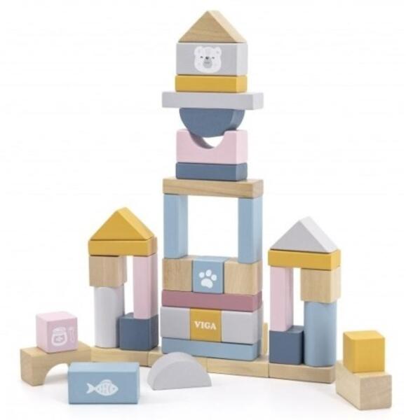 60 darabos pasztell építő elemekből álló fa építőjáték. A darabok különböző színűek és formájúak, különleges elemeket is tartalmaz a készlet. Az építőkockák élei és sarkai lekerekítettek. Az építőkockákkal való játék rendkívül jótékonyan hat a kisgyermek értelmi és nyelvi fejlődésére. Ez a pasztell fa építő kocka szett különböző építő elemeke