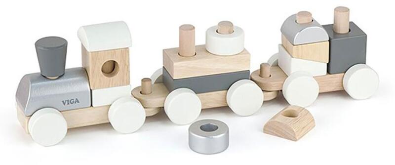 Szürke-fehér vonat vonzó vontatható kocsikkal, aktív kisgyermekek számára készült. Ez a vonat segít a kéz-szem koordináció fejlesztésében, támogatja a logikus gondolkodást, és lehetőséget ad a kreatív játékra. A készlet tizennégy színes kockát tartalmaz, a szezon legtrendibb árnyalataival, amelyeket fából készült kampókra helyezve kombinálhatunk a három mozgathat