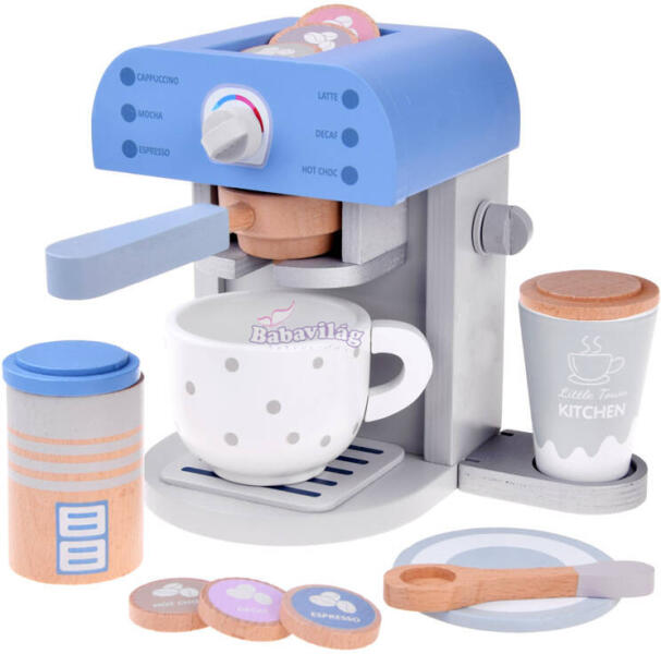 Egy szép és elegáns fa kávéfőző csészével és kiegészítőkkel minden konyha, iroda vagy kávézó elengedhetetlen kelléke. A játék teljes egészében fából készült, a következő színekben: fehér, a kék több árnyalata és a klasszikus fa. A kiváló minőségű kidolgozás és a legapróbb részletekre való odafigyelés is kellemessé és pihentetővé teszi minden játéko