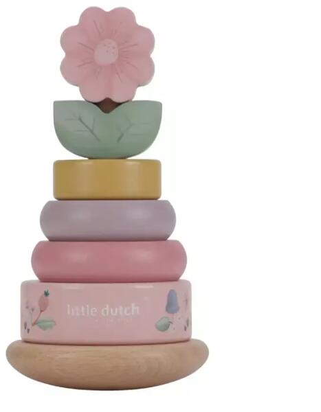 Mit kell tudni a játékról? Little Dutch montessori torony - virágos Kislányos színekkel összeállított, gyönyörű szép, kiváló minőségű montessori torony, melynek billegő alapjából kiálló rúdjára 6 elem helyezhető. A 6 fa elem közül 4 darab korong, amiknek átmérőjük eltérő. A korongokat nagyság szerint csökkenően kell a rúdra helyezni, tetejére pedig egy kis vi