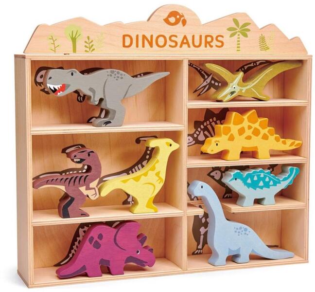 Tender Leaf Toys - fa állatfigurák - dinoszaurusz készlet polccal A készlet 8 darab színes dinoszauruszt tartalmaz, minden fajtából egy darabot. A készletben megtalálható a T-Rex, Velociraptor, Triceratopsz is. A készlet egy gyönyörű polcrendszert is tartalmaz, ahol minden egyes dinoszaurusznak megtalálható a saját helye. Gyönyörű játék készlet a Tender Leaf Toys gondozásá