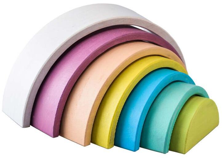Hét színű szivárvány, fa építőjáték . Össze tudod állítani a megfelelő sorrendben? Ezek a pasztell színű, kemény fából készült, stabil félkörök könnyen bevezetik a kisgyermeket a tevékenykedve alkotás világába, és közben fejlődik a motorikus képességük. . Vízalapú és nyálbiztos - nedvességálló - festékeivel nemcsak esélyt kínálnak a színek és formák