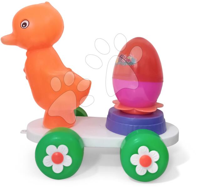 Húzható kiskocsi kacsafigurával és tojással gyerekeknek 3 éves kortól. A színes játékautó minőségi műanyagból készült, a biztonságosság érdekében élei lekerekítettek. A kisautó hozzájárul a képzelet és fantázia fejlesztéséhez, játék közben a gyerekek fejlesztik a finommotorikát és megtanulják felismerni a színeket. A kiskocsi elülső részén lévő nyíláso