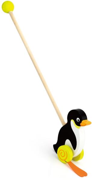 Szép tologatós fajáték Viga pingvin gyermekek számára. Tökéletes oktatási játék. Ideális sétáláshoz és othoni játszáshoz. Élvezzen vele sok örömet és szórakozást. A kerekeken található gumi, vicces módon utánozzák az állatokat. A játék segíti a gyermekeknek megismerni a formákat és színeket. A játék festett fa. Kiemelt fontosságúnak tartjuk a biztonságot é