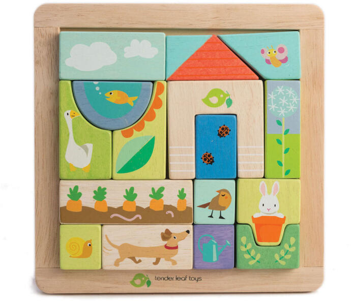 Tervezte és készítette a Tender Leaf Toys Puzzle és építőkocka kerti hangulatban. 17 darabos szett Fenntartható forrásból származó alapanyagokból készült, bababarát színekkel színezve. 18hó+