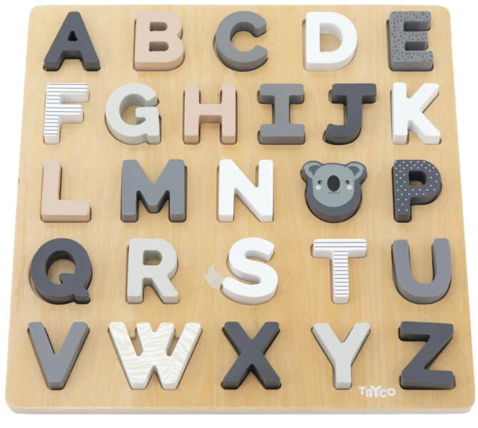 Tryco - fa ábécés kirakós nyomtatott nagy betűket tartlmaz. Segít a gyerekeknek a betűk világát megismertni és közben fejleszti a szem-kéz koordinációját, és a finommotorikáját a betűk vissza helyezésével! Anyaga: fa 26 db betű Toxikus anyagot nem tartalmaz