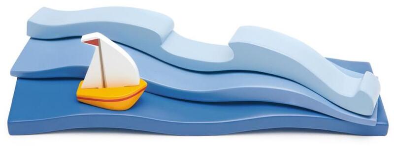 Tender Leaf Toys 8755 kék víz hullámai és fa vitorláshajó. A Tender Leaf kínálja ezt az igényes, szép kivitelezésű, 3 ívelt, kék elemből áll vizes hullámokat idéző fa építőjátékot, a Blue Water faépítőt. A 4 darabos készlet ívelt, hullámos kialakítású, a kéklő tenger színeivel festett, visszafogott, esztétikus megjelenésű játék. Tökéletes a vízi állatok