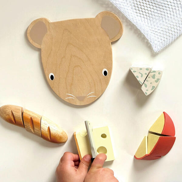Tender Leaf Toys sajtvágódeszka Egy egér formájú fa sajttábla sajtokkal. Remek kis étel aprító készlet baba konyháinkhoz. Tartalma: egy egérsajt kés, egy bagett 3 részből, egy Edam sajt 3 részből, egy Gruyere, egy Rouleux és egy kék sajt 2 részből. Tépőzárral rögzítve a könnyű vágás érdekében. Tartozik hozzájuk egy praktikus textilzsák a tároláshoz. Ez a sajttá