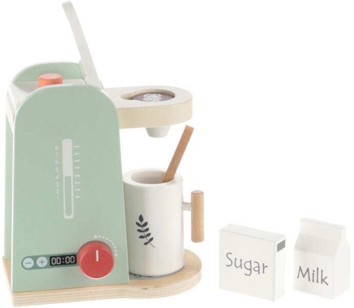 A kifinomult, fából készült kávéfőző közvetlenül jó kávé elkészítésére hívja gyermekét. A kávéfőzőnek több gombja van, melyek forgathatók vagy megnyomhatók. Tartalmaz egy nagy fapoharat egy kanállal és a kávéfőzéshez szükséges hozzávalókat. A játék kiváló minőségű fából és vízbázisú festékekből készült. - Kávégép kialakítás- Kompakt mérete