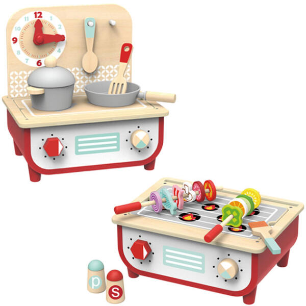 Gyermeke egy igazi szakács szerepét öltheti magára ennek a 2 az 1-ben konyhai grillsütőnek a segítségével. A készlet tartalmaz zöldségutánzatot, serpenyőt, serpenyőt, serpenyőt, grillkonyhát és egyéb konyhai kiegészítőket. Javítja a szem-kéz koordinációt, fejleszti a finommotoros készségeket, játék közben beindítja a képzeletet és a kreativitást. Alkalmas 3 éves