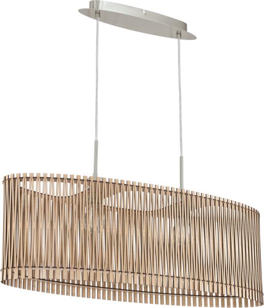 Ezt a Sendero függesztett lámpát az Eglo gyártja. Juhar színű fa burája ovális alakú, átmérője 775 mm, magassága 250 mm, a maximális belógása pedig 1300 mm. A belógás magasságát te állíthatod: ha magasabbra szeretnéd húzni, a felesleges kábelmennyiséget tekerd a mennyezethez csatlakozó pogácsába. Súlya közel 2 és fél kg. A lámpa két fényponttal rendelkezik, fogl