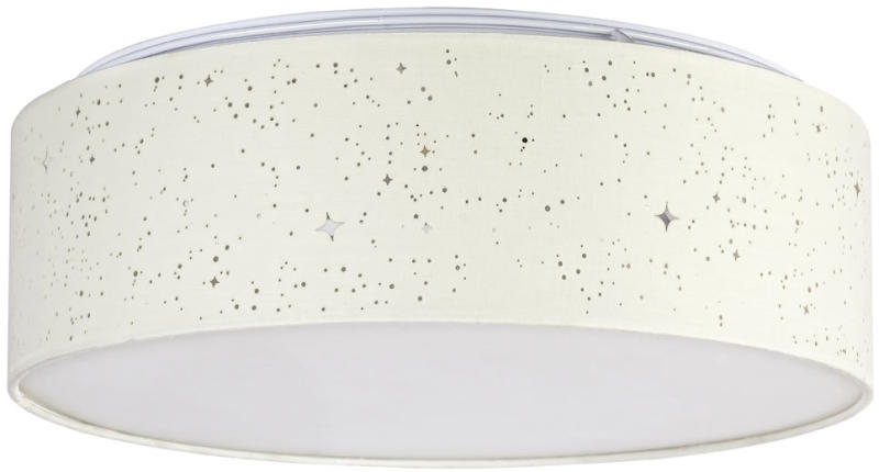 A krémszín-fehér színkombinációban készült Otilia mennyezeti lámpa szinte bármely modern nappali, hálószoba vagy dolgozószoba berendezésének kellemes darabja lehet. Az egyszerű, henger alakú lámpatest anyaga fém, míg a fényes, csillagos mintával átszőtt búra textilből készül. A nagyméretű, kerek modell alul teljes felületén engedi kiáramlani a fényt, így szépen