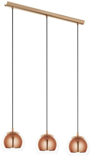 Ezt a Rocamar hármas függesztett lámpát az Eglo gyártja. Külső burája áttetsző üveg, belső burája pedig réz színű acél. A két burát a réz foglalat csatlakoztatja. A külső bura átmérője 190 mm, a lámpa teljes szélessége 780 mm, a maximális belógása pedig 1100 mm. A belógás magasságát te állíthatod: ha magasabbra szeretnéd húzni, a felesleges kábelmennyiséget