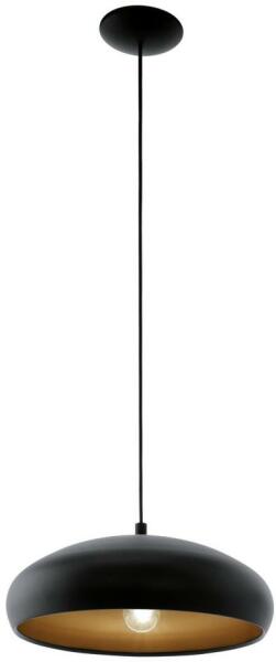 Ezt a Mogano mennyezeti lámpát az Eglo gyártja. Kívül fekete, belül vörösréz acél burája 400 mm átmérőjű, a maximális belógása pedig 1100 mm. A belógás magasságát te állíthatod: ha magasabbra szeretnéd húzni, a felesleges kábelmennyiséget tekerd a mennyezethez csatlakozó pogácsába. Súlya közel 2 és fél kg. A lámpa egy fényponttal rendelkezik, foglalata E27 (max